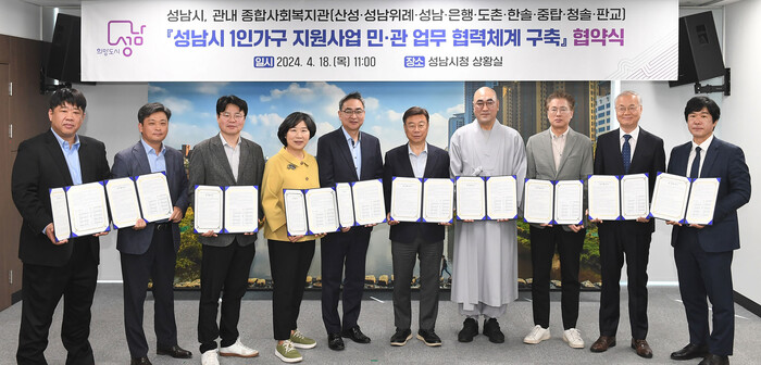 성남시는4월18일 오전11시시청4층 상황실에서신상진 성남시장과지역 내9곳 종합사회복지관장 등이 참석한 가운데‘1인 가구 지원사업 민·관 업무 협력체계 구축에 관한 업무협약’을 했다.