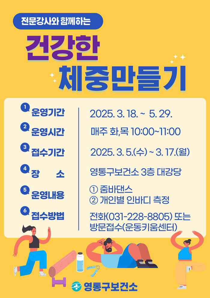 수원 영통구보건소가 중년여성을 대상으로 하는 ‘건강한 체중 만들기’ 프로그램의 참가자를 17일까지 모집한다.