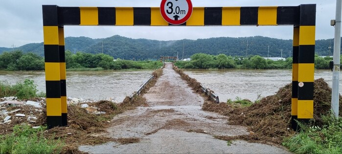 지난 8일부터 11일까지 평균 300mm가 넘게 집중호우가 내린 평택시 진위면, 서탄면 등 북부지역 진위천 일대 피해현장을 방문한 정장선 평택시장이 피해에 대한 현황보고를 받고 향후 복구 방안을 지시하고 있다.