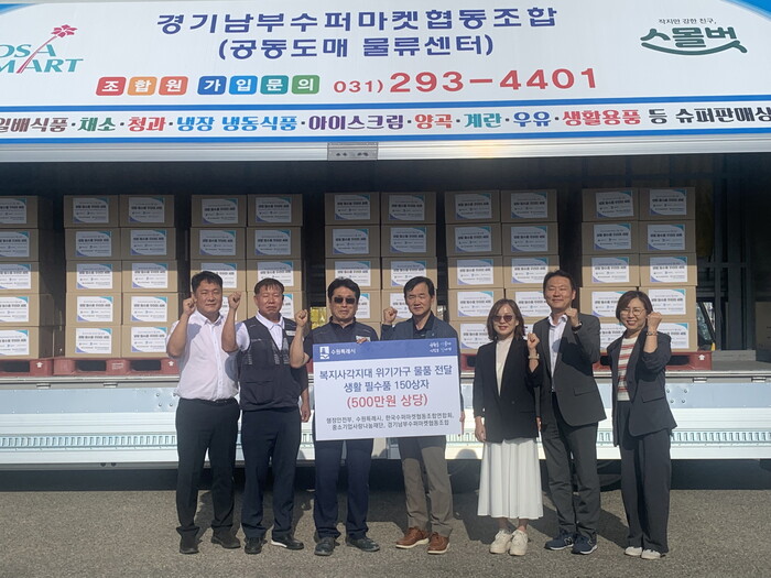 경기남부수퍼마켓협동조합은 지난 9일 행정안전부 스마트복지안전공동체추진단, 중소기업중앙회사랑나눔재단, 한국수퍼마켓협동조합연합회와 업무협약을 체결하고, 민관이 함께 위기가구 지원체계를 강화하기로 약속했다. 이번 기부는 업무협약의 하나로 이뤄졌다.