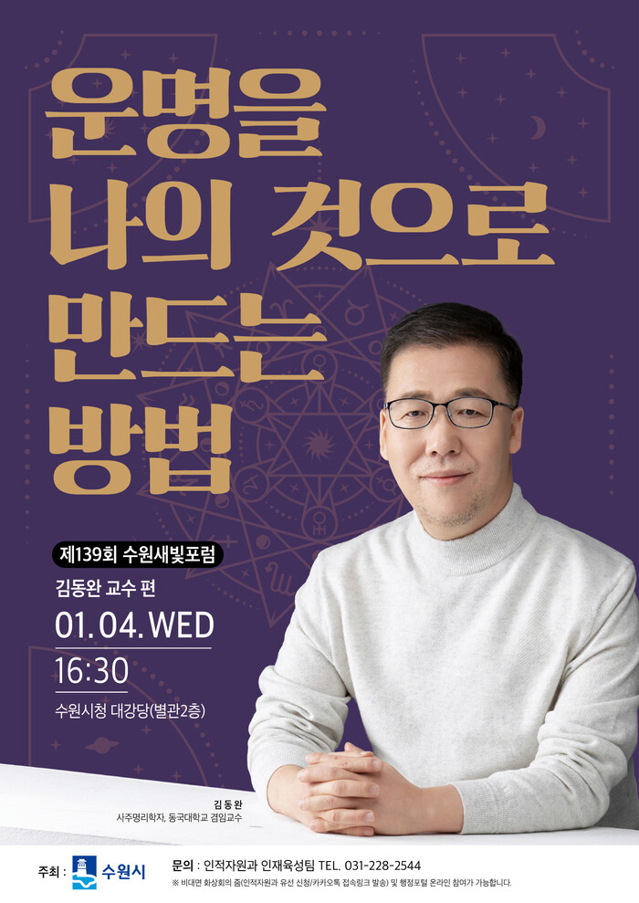 수원시가 ‘운명을 나의 것으로 만드는 방법’을 주제로 내년 1월 4일 오후 4시 30분 시청 대강당에서 제139회 수원새빛포럼을 연다.‘수원새빛포럼’은 수원포럼의 새로운 이름이다.