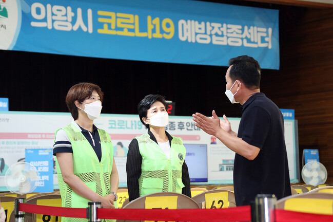 의왕시의회 윤미경 의장과 이랑이 부의장이 27일 코로나19 백신접종센터를 찾아 폭염 속에서 일하고 있는 의료진과 관계자들을 격려하고 봉사활동을 펼쳤다.