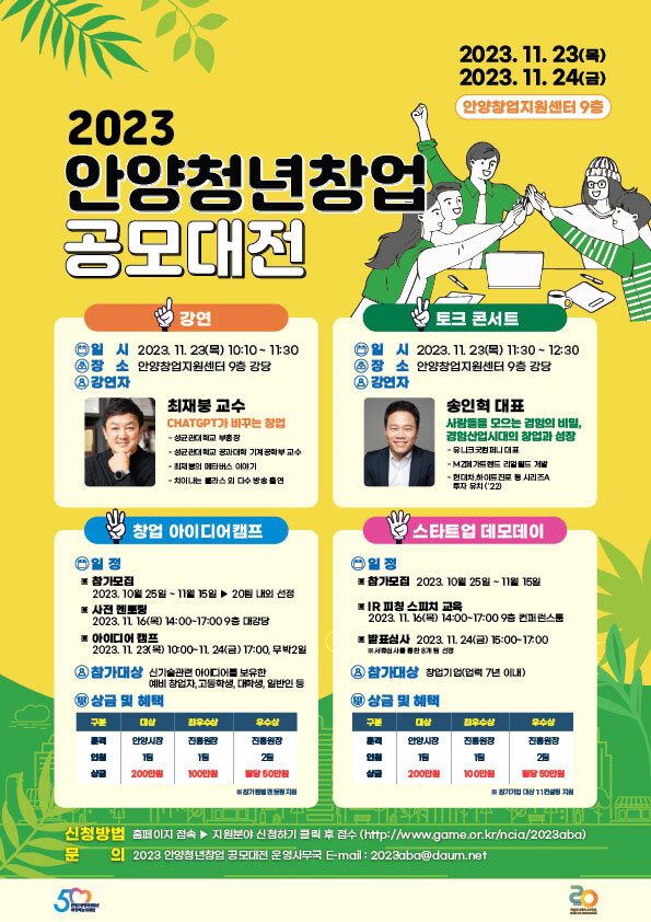 안양시(시장 최대호)가 주최하고 안양산업진흥원이 주관하는 ‘2023 안양청년창업 공모대전’이 오는 23일과 24일 양일간 안양창업지원센터에서 개최된다.