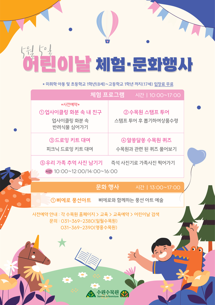 ▲삐에로 풍선아트 ▲업사이클링 화분 속 내 친구 ▲우리 가족 추억 사진 남기기 ▲수목원 스탬프 투어 ▲드로잉 키트(그림그리기 꾸러미) 대여 ▲알쏭달쏭 수목원 퀴즈 등 다양한 문화·체험프로그램을 준비했다. 17세 이하 어린이는 어린이날(5월 5일)에 수원수목원을 무료로 입장할 수 있다.