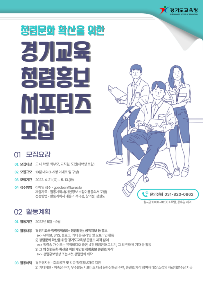 참여희망자는 개인 또는 팀 단위로 지원이 가능하며 자세한 사항은 도교육청 누리집 ‘청렴한 경기교육’에 공유된 안내문을 참고하거나 담당자에게 전화(031-820-0862)로 문의하면 된다.