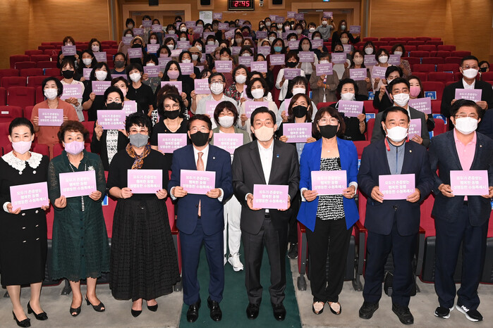 사진/이재준 수원시장(앞줄 오른쪽 4번째), 김기정 수원시의회 의장(앞줄 오른쪽 5번째)를 비롯한 기념식 참가자들이 ‘모두가 존중받는 행복한 동행 성평등한 수원특례시’라는 글이 적힌 손팻말을 들고 있다.(사진제공=수원시)