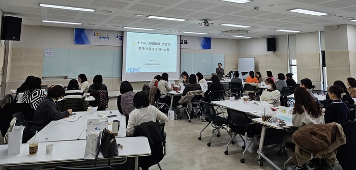 워크샵에서는 기본 및 직무 교육으로 ‘내 일(My Job)의 희망 만들기’를 주제로 한 셀프 리더십 및 직무 자긍심에 대한 강의와 아주대학교병원 김경미 과장의 ‘호스피스완화의료 운영 및 환자·가족과의 의사소통’을 주제로 한 강의가 진행됐다.
