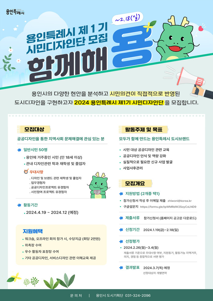 제1기 시민디자인단 모집 인원은 50명 내외이며 내달 18일까지 접수를 받는다. 공공디자인에 관심 있는 만 18세 이상 용인시민이라면 누구나 신청할 수 있다. 디자인과 브랜드 관련 재학생과 졸업자, 공공 디자인프로젝트나 시민참여 프로젝트 유경험자는 우대한다. 신청은 개인 또는 팀 단위 모두 가능하다.