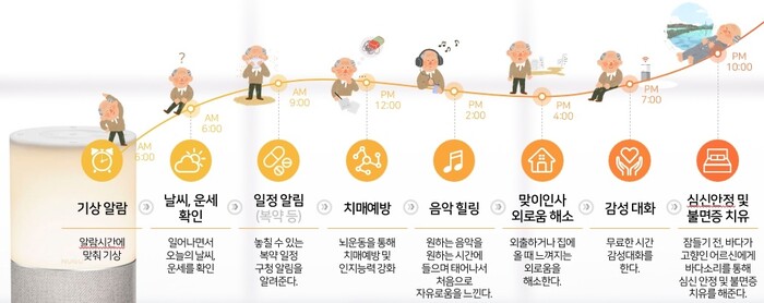 AI 스피커는 기상 알림, 일정 알림(복약 등), 음악 힐링, 맞이 인사, 감성 대화 등 돌봄서비스를 제공한다.