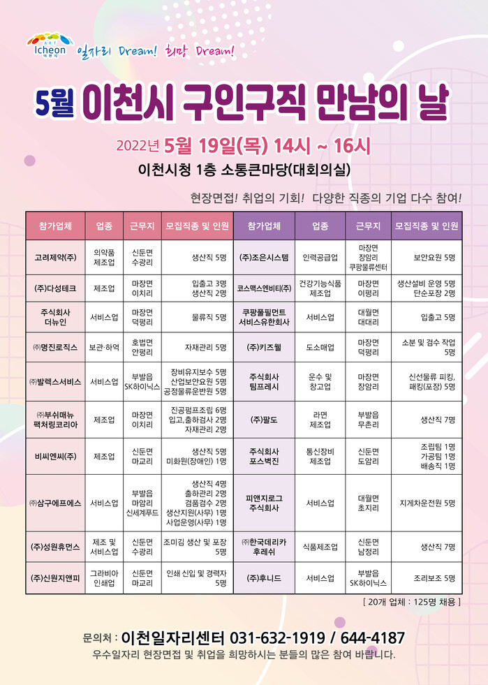 이천시청 1층 소통큰마당(대회의실)에서 진행되는 ‘구인구직 만남의 날’ 행사는 20개의 다양한 직종의 중소기업이 다수 참여해 125명을 채용할 예정이며 오후 2시~ 4시까지 2시간동안 진행된다.