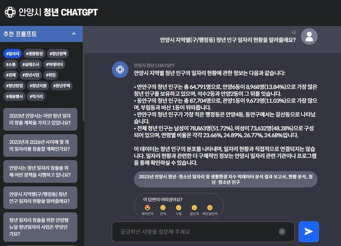 안양시가 구현한 청년 챗GPT는 정책, 생활환경, 소비패턴 및 유동인구, 일자리 등 각종 청년 관련 정보를 분석하고 학습해 시민의 질문에 데이터로 답변하는 대화형 정보 제공 서비스다.