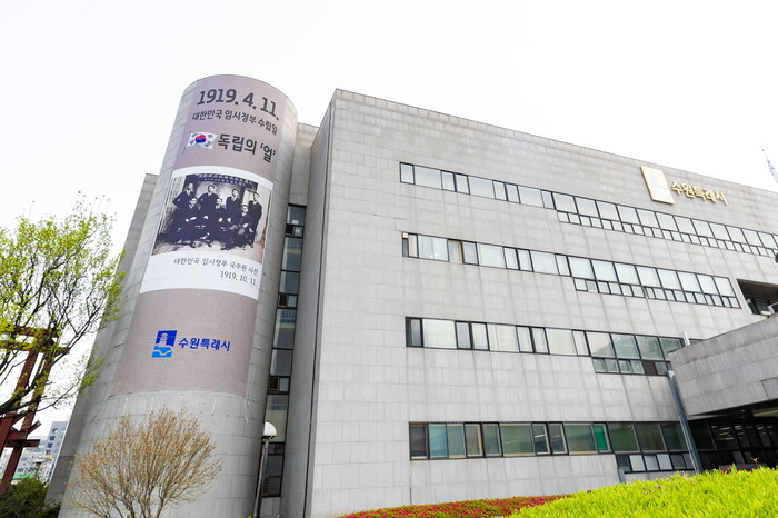 수원시(시장 이재준)가 제105주년 대한민국 임시정부 수립을 기념해 시청 본과 외벽에 대한민국 임시정부 국무원 요인들의 사진을 인쇄한 대형 현수막을 게시했다.