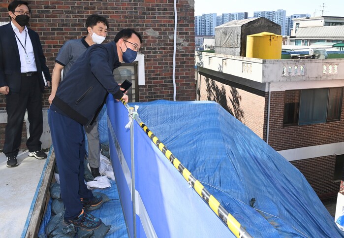 사진/조청식 제1부시장이 비 피해가 발생했던 고등동 A연립주택을 점검하고 있다.(사진제공=수원시)