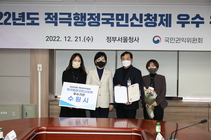 수원시가 ‘2022년 국민권익위원회 적극행정국민신청제’ 우수기관으로 선정돼 국민권익위원회 위원장 표창을 받았다. 시상식은 21일 정부서울청사에서 열렸다.