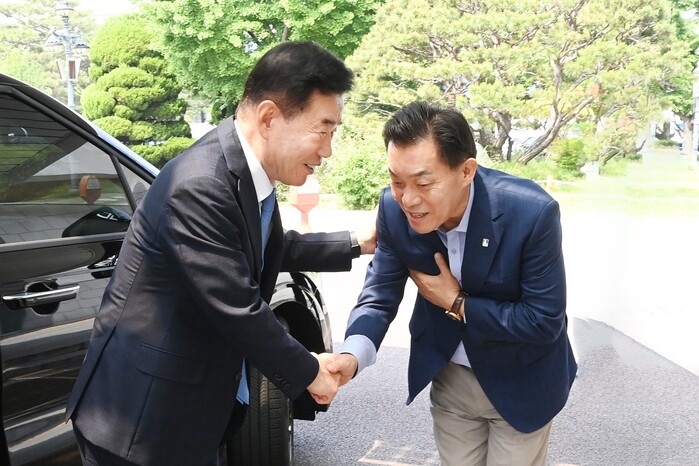 사진/이재준 수원특례시장(오른쪽)이 정담회 참석차 수원특례시청을 방문한 김진표 국회의장(왼쪽)과 인사를 나누고 있다. (사진출처=이재준 페이스북)