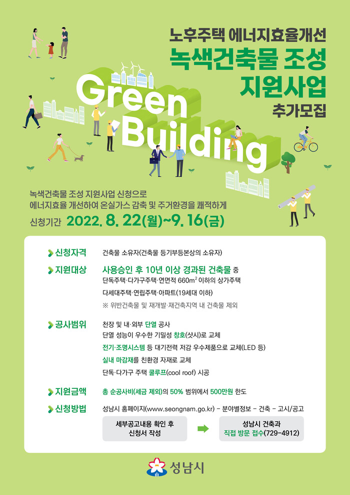 성남시는 오는 9월 16일까지 녹색건축물 조성 지원 사업 대상자를 추가 모집한다.