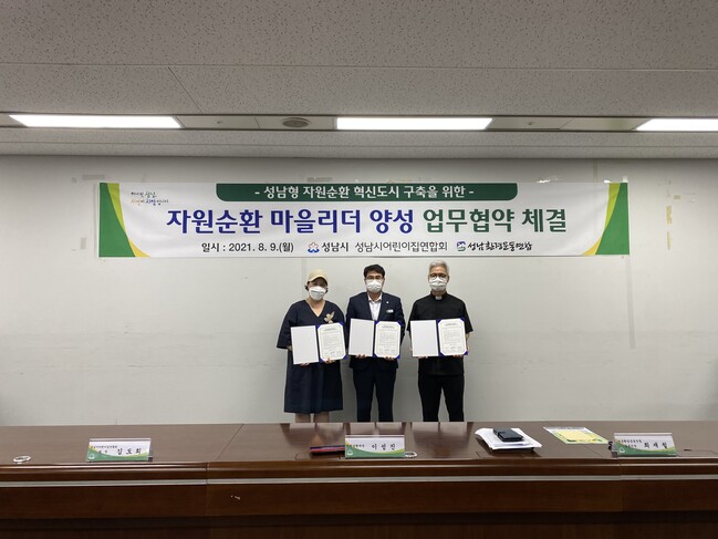 성남시(시장 은수미)는 8월 9일 오후 1시 푸른도시사업소 회의실에서 성남시 어린이집 연합회, 성남환경운동과 ‘자원순환마을리더 양성 추진에 관한 업무협약’을 체결했다고 밝혔다.