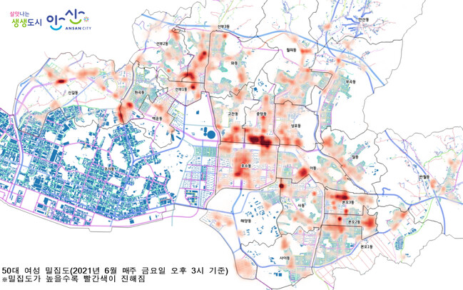 시는 이를 토대로 올 6월 한 달 동안 매주 금요일(4·11·18·25일) 오후 3시를 기준으로 스마트폰 위치정보를 분석한 결과, 50대 여성은 이 시간에 중앙동에 가장 많이 있는 것으로 파악됐다. 이어 본오3동, 선부동, 문화광장 등 순으로 많이 분포해 있었다.