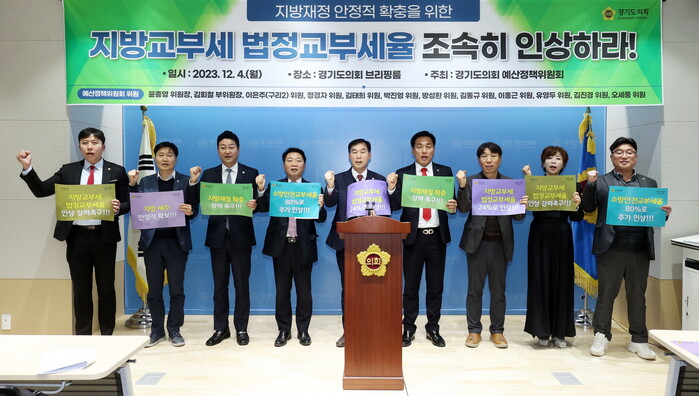 경기도의회에서는 금일 4일 브리핑룸에서 예산정책위원회 윤종영 위원장(국민의힘, 연천)을 비롯한 위원들은 ‘지방교부세 인상’을 주요 골자로 하는 법률개정 촉구 결의대회를 개최하였다.