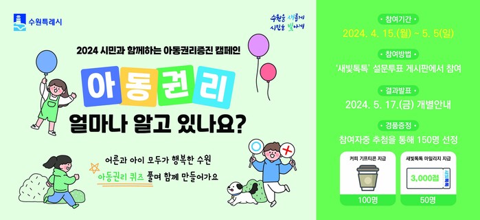 수원시(시장 이재준)가 어린이날을 맞아 5월 5일까지 ‘아동친화도시 알고 있나요?’ 퀴즈 이벤트를 연다.