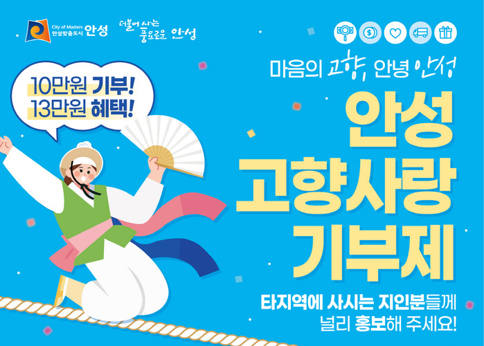 모아진 고향사랑기부금은 사회적 취약계층 지원, 청소년 육성 및 보호, 지역주민의 문화·예술·보건 증진, 지역공동체 활성화 등 안성시 지역발전에 사용될 계획이다.