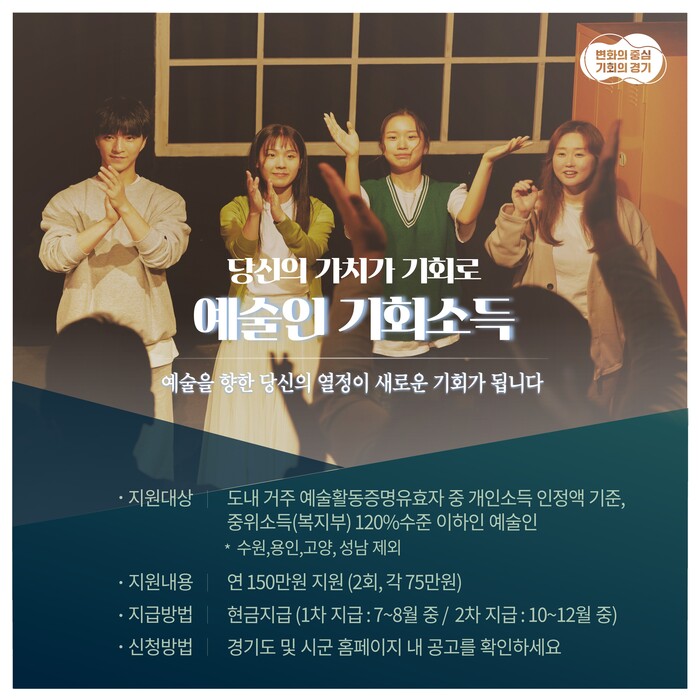 소득과 재산 조사를 거쳐 조건을 충족한 예술인에게는 연 150만 원을 2회 분할지급하며, 1차는 7월 20일 이후 소득 조사 완료 순서에 따라 순차 지급되고, 2차 지급은 10월에서 12월 중 이뤄질 예정이다.