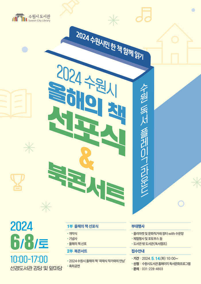 수원시(시장 이재준)가‘2024 수원시민 한 책 함께 읽기: 수원 독서 플레이그라운드’를 6월 8일 오전 10시~오후 5시 선경도서관에서 연다.