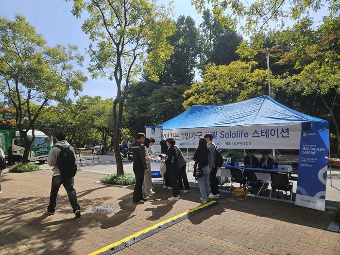 사진/ 수원시가 성균관대 자연과학캠퍼스 기숙사 인근에서 찾아가는 ‘1인가구 새빛 솔로라이프 스테이션’을 운영하고 있다.(사진제공=수원시)