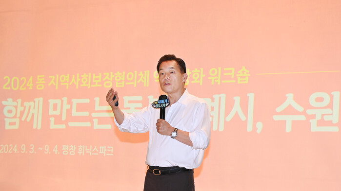 2024 수원시 동 지역사회보장협의체 워크숍은 3~4일 강원도 평창군 일원에서 열렸다. 이번 워크숍에는 지역사회보장협의체 위원 130여 명이 참석했다. 수원시 지역사회보장협의체 공공위원장인 이재준 시장은 3일 평창 휘닉스파크 포레스트홀에서 ‘함께 만드는 돌봄특례시, 수원’을 주제로 특강을 했다.
