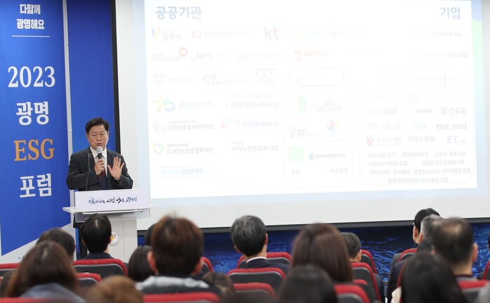 시는 12일 오후 광명시평생학습원 1층 강당에서 ‘ESG를 통한 공공기관과 지역기업의 동반성장 전략’을 주제로 2023년 광명 ESG 포럼을 개최했다. 광명시 공공기관과 민간기업이 한 자리에 모여 ESG를 통한 상생협력 방안을 논의하는 것은 이번이 처음이다.