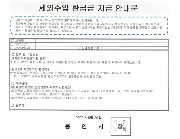 환급안내문을 받은 납세자가 안내에 따라 환급 신청을 하면, 납세자 본인 계좌로 과오납금을 되돌려 받을 수 있다.