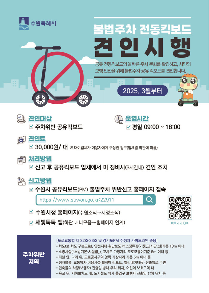 수원시 관계자는 “보행자의 안전을 확보하고, 전동킥보드를 질서 있게 주차하는 문화가 조성되도록 유도하겠다”며 “공유 모빌리티 활성화를 위한 기반을 조성하기 위해 노력하겠다”고 밝혔다.