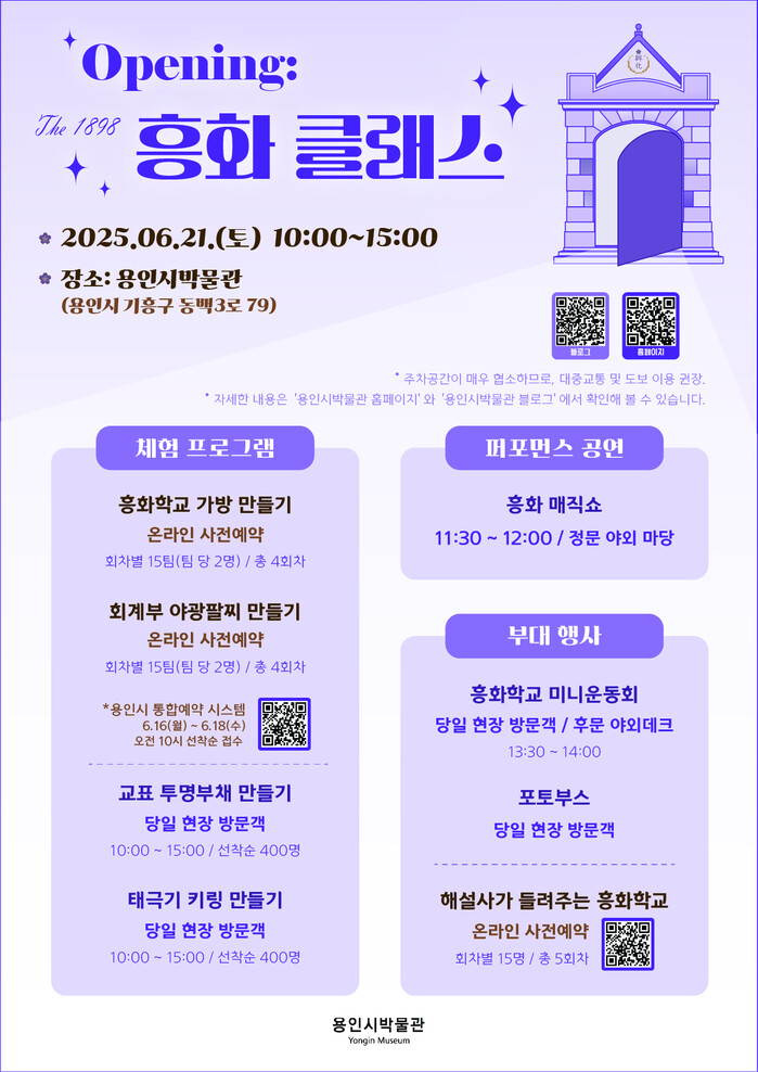 용인특례시(시장 이상일)는 21일 용인시박물관에서 기획전 ‘興.化. 잊혀진 교실을 열다’와 연계한 체험 행사 ‘opening : The 1898 흥화 클래스’를 진행한다고 5일 밝혔다.