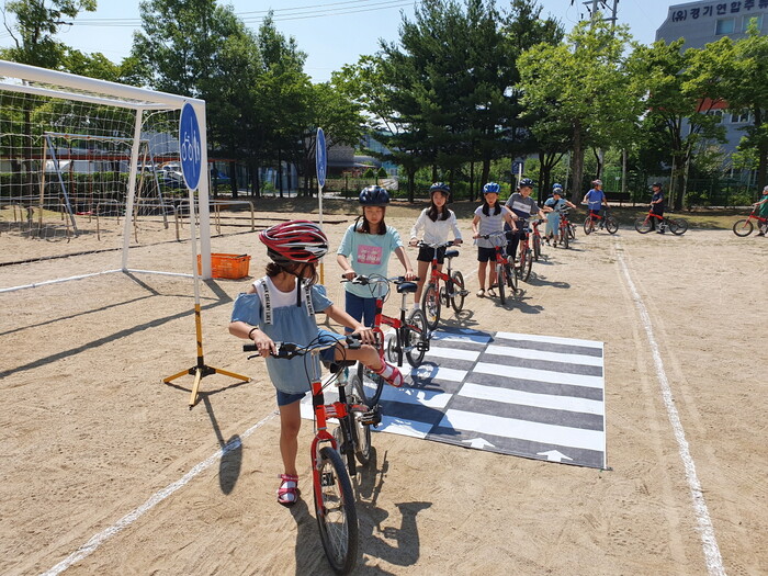 사진/어린이들이 자전거 안전수칙, 올바른 주행 요령 등을 배우고 있다.(사진제공=수원시)