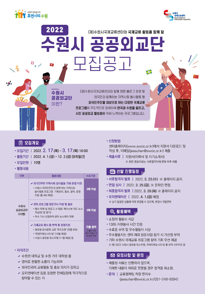 활동을 원하는 대학생은 수원시국제교류센터 홈페이지(www.swcic.or.kr) ‘새소식/공지사항’ 게시판에서 ‘2022년 수원시 공공외교단 모집공고’에 첨부된 지원서를 내려받아 작성한 후 3월 17일 오후 4시까지 담당자 전자우편(jeesuhan@swcic.or.kr)로 제출하면 된다.
