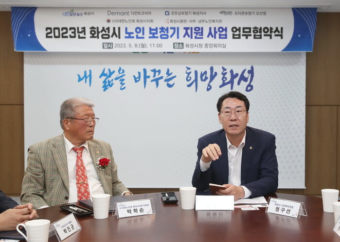8일 화성시청 중앙회의실에서 진행된 협약식에는 정명근 화성시장을 비롯해 박학순 대한노인회 화성시지회장, 박진균 디만트코리아 대표, 안덕진 굿모닝보청기 화성지사 대표, 류한동 오티콘보청기 오산점 대표, 최혜욱 화성시동탄노인복지관장, 박정숙 화성시서부노인복지관장, 김영진 화성시남부노인복지관장 등 8명이 참석했다.