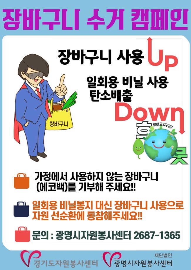 장바구니 수거 캠페인 관련 궁금한 내용은 광명시자원봉사센터(☎02-2687-1365)로 문의하면 된다.