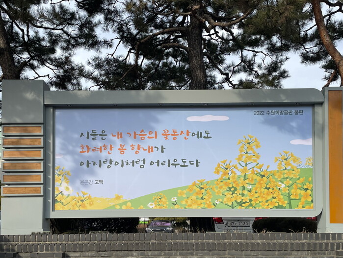 수원시가 ‘2022년 수원희망글판 봄편’ 문안 ‘시들은 내 가슴의 꽃동산에도 화려한 봄 향내가 아지랑이처럼 어리우도다’를 5월 말까지 시내 곳곳에 게시한다.