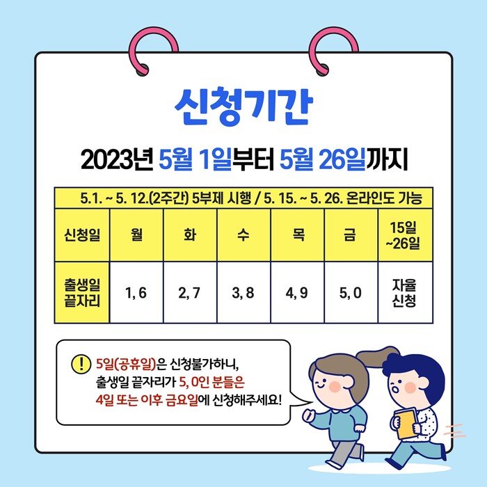 5부제 기간 동안 신청하지 못한 경우에는 15에서 26일 사이에 추가로 신청할 수 있다. 이 기간에는 5부제를 적용하지 않고 거주지 읍면동 행정복지센터뿐 아니라 복지로(www.bokjiro.go.kr) 사이트에서도 신청이 가능하다.
