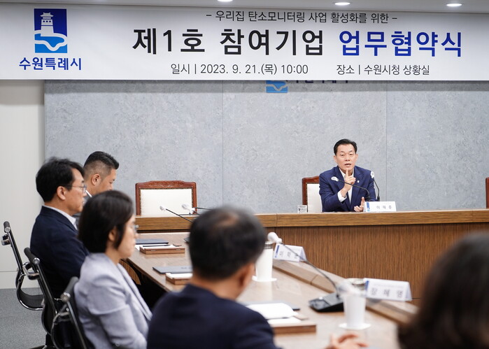 수원시와 롯데백화점 수원점, 이학순베이커리, 아주대학교 탄소제로에너지센터, 아파트입주자대표협회는 21일 시청 상황실에서 ‘우리집 탄소모니터링 사업 제1호 참여기업 업무협약’을 체결하고, 협력을 약속했다.