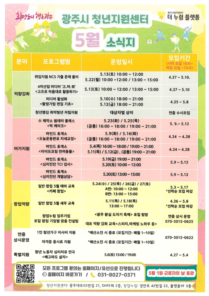 광주시 청년지원센터‘더누림 플랫폼’은 5월 한 달간 청년의 취업 역량 강화와 주거환경 조성 지원을 위한 다양한 프로그램을 실시한다.