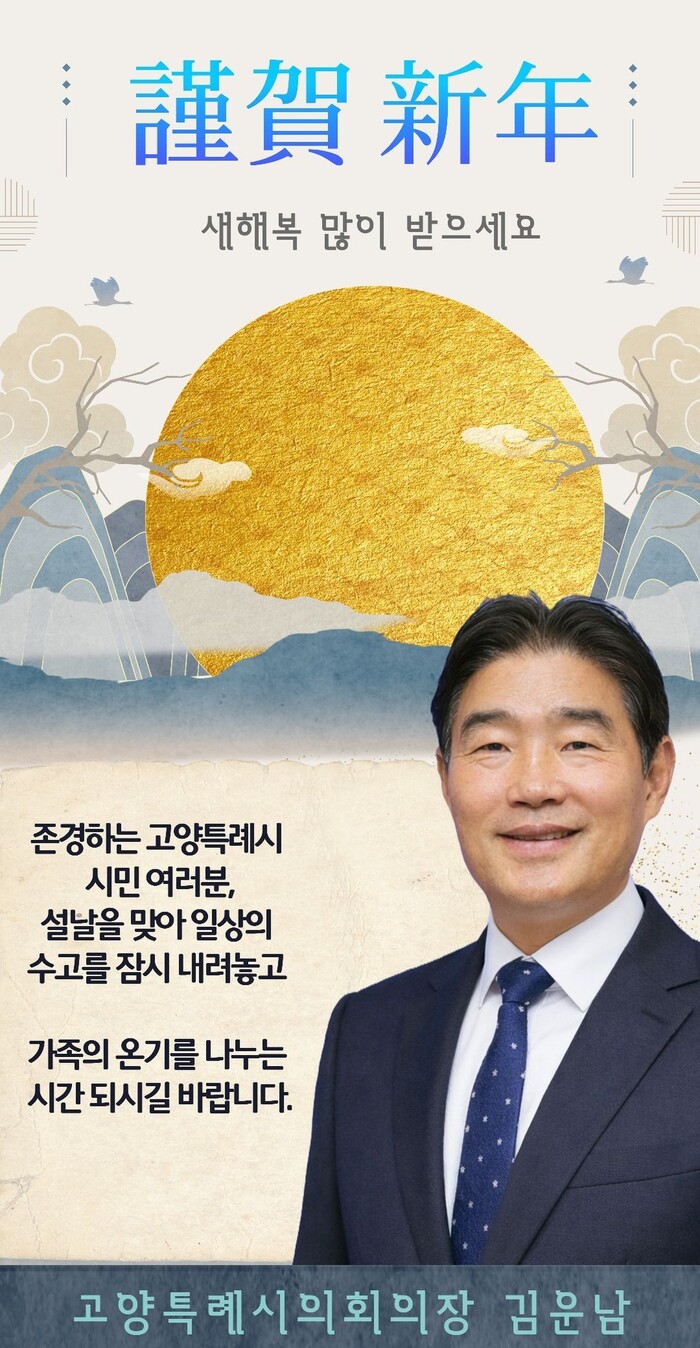 [고양=로컬라이프] 송준형 기자 = 김운남 고양특례시의회 의장은 13일, 자신의 페이스북을 통해 고양 시민 여러분, 2026년 병오년 새해 복 많이 받으십시오. 가족과 함께 행복한 설 명절 보내시길 기원드린다고 말했다.
