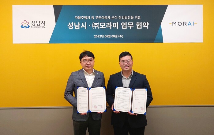시는 이날 오전10시30분㈜모라이 사무실에서 주광호 성남시 아시아실리콘밸리담당관,정지원 모라이 대표 등이 참석한 가운데‘자율주행차 등 무인 이동체 분야 산업발전을 위한 업무 협약’을 했다.