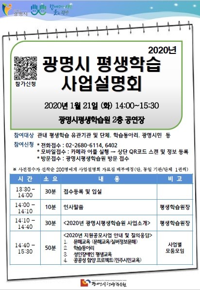 시는 오는 21일 오후2시 광명시평생학습원에서 ‘2020년 광명시 평생학습 사업설명회’를 개최한다.