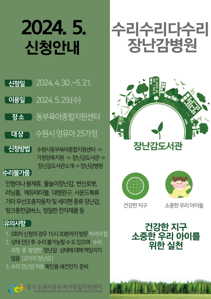 장난감병원은 수원시동부육아종합지원센터 ‘장난감도서관’에서 운영한다. 영유아 가정을 대상으로 분기별 1회, 센터 홈페이지(www.swescc.or.kr)에서 신청받는다.