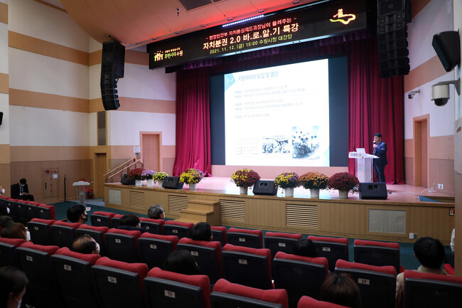 수원시는 12일 시청 대강당에서 ‘자치분권 2.0 바로알기’ 특강을 열고, 공직자와 시민들에게 지방자치법 전면개정에 따라 달라지는 자치분권 제도를 알렸다.