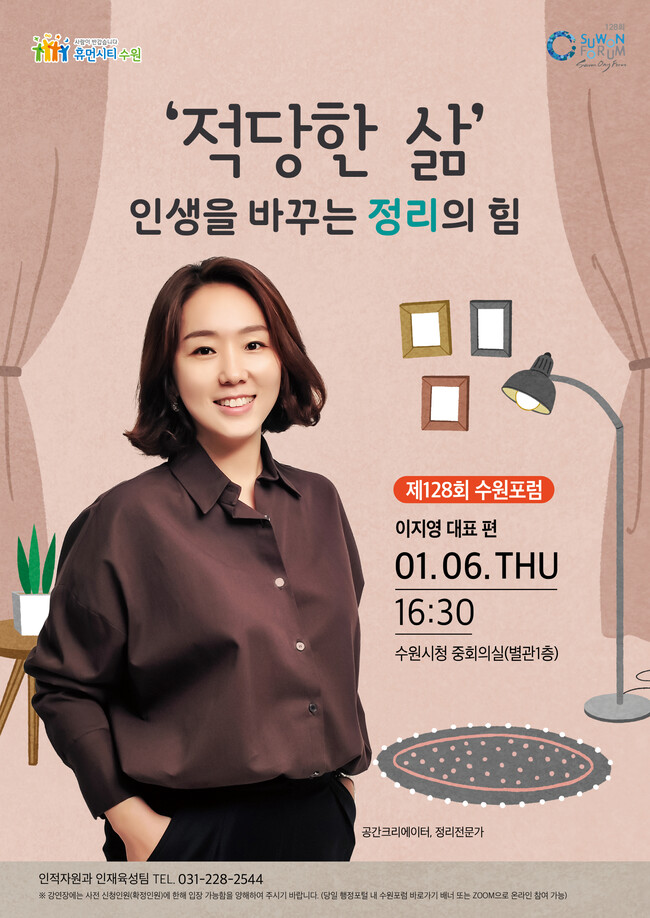 수원시는 내년 1월 6일 오후 4시 30분 ‘적당한 삶 – 인생을 바꾸는 정리의 힘’을 주제로 제128회 수원포럼을 연다.