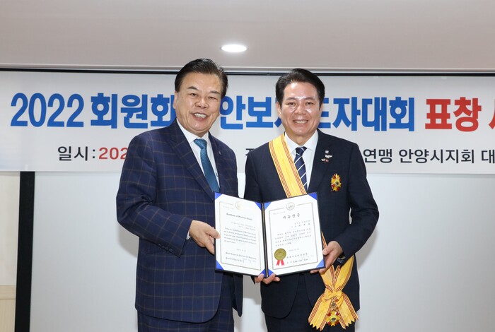 5일 안양시에 따르면 지난 2일 동안구 자유센터에서 개최된 한국자유총연맹 안양시지회 회원화합 안보지도자대회에서 최창환 경기도지부 회장이 세계자유민주연맹 야오잉치(Yao Eng Chi) 회장을 대신해 최 시장에게 자유장을 전달했다.