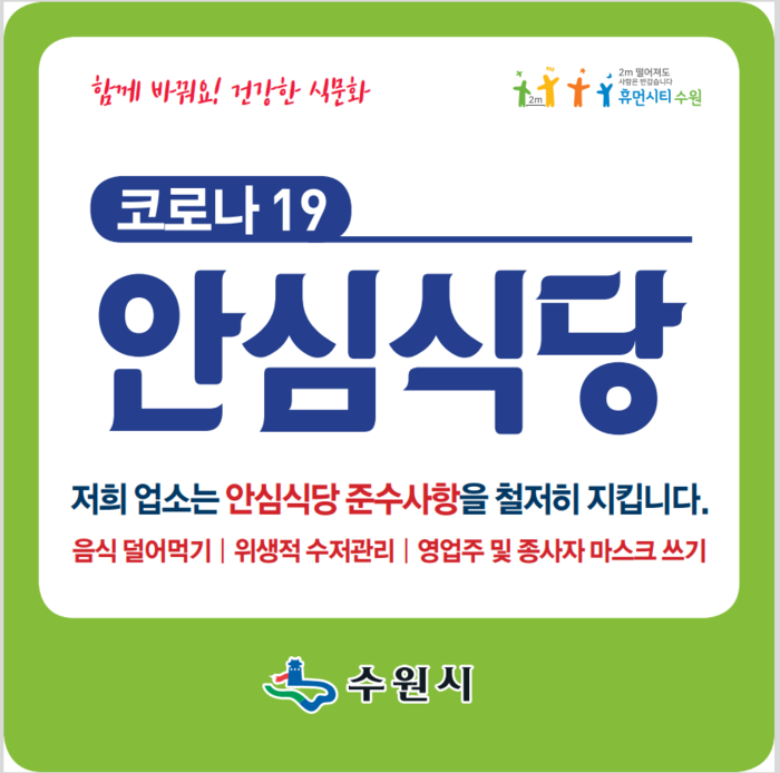 수원시는 식사문화를 개선하고, 생활방역 수칙 준수로 코로나19 확산을 예방하기 위해 올해 ‘코로나19 안심식당’ 228개를 추가 지정했다.