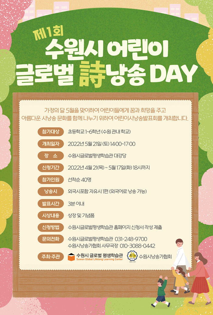 수원시글로벌평생학습관 홈페이지(https://learning.suwon.go.kr) ‘평생교육 수강 신청’에서 ‘제1회 수원시 어린이 글로벌 시 낭송 DAY’를 선택해 신청하면 된다. 참가비는 없다.